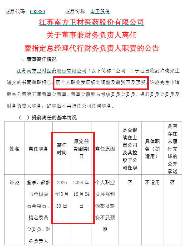 江苏常州上市公司南卫股份(603880.SH)在3月30日发布公告,1月12日空降上任的财务负责人许晓申请辞职离开公司。辞职理由是“因个人职业发展规划调整及薪资不及预期”。